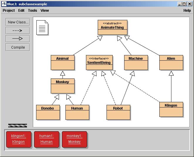 Here is a simple example of some classes. Try downloading and uncompressing the BlueJ project file. You should see something like the picture below (minus the instances). You can create some instances, call their methods, and inspect their variables. Note the use of an abstract class and of an interface class.