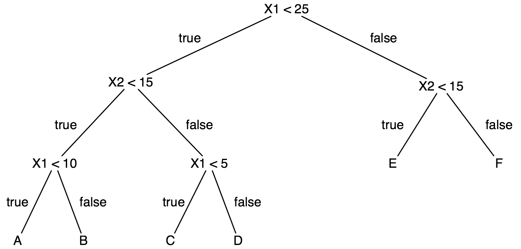 (A) Draw the decision boundaries defined by this tree. That is, draw in the plane defined by X1 and X2 the rectangular regions corresponding to the subset of the instance space covered by each leaf. Each leaf is labeled with a letter. Write this letter in the corresponding region of instance space.