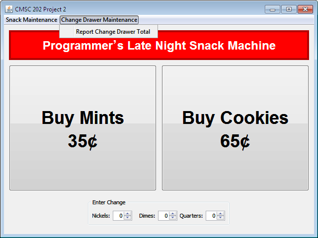 To use the snack machine, the CMSC 202 student inserts some change (nickels, dimes and/or quarters only) and pushes either the “Buy Mints” button or the “Buy Cookies” button. If the student has inserted the correct amount of money and the snack machine is not sold out, the application displays a “success” message. The “success message” when a package of mints is purchased displays the color of the mints as part of the message. The “success message” when a bag of cookies is purchased indicates the flavor. If the purchase fails, the application displays a “failure” message. Snacks are sold in “first-in, first-out” order (oldest ones first) — no one wants a stale bag of cookies at 4:30 in the morning!
