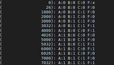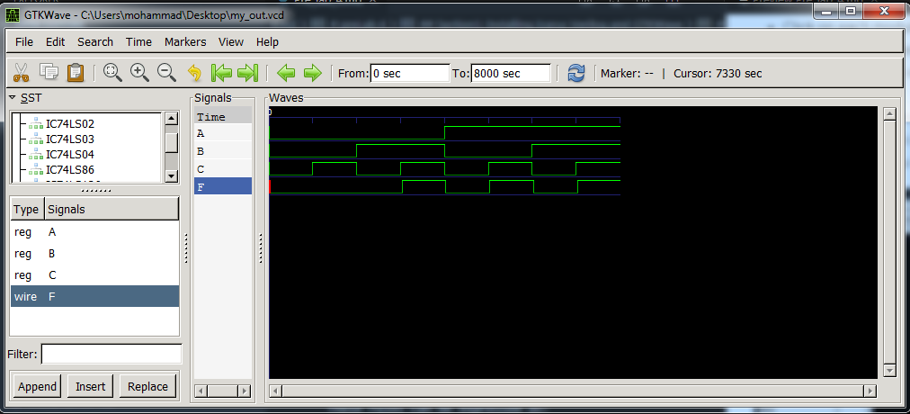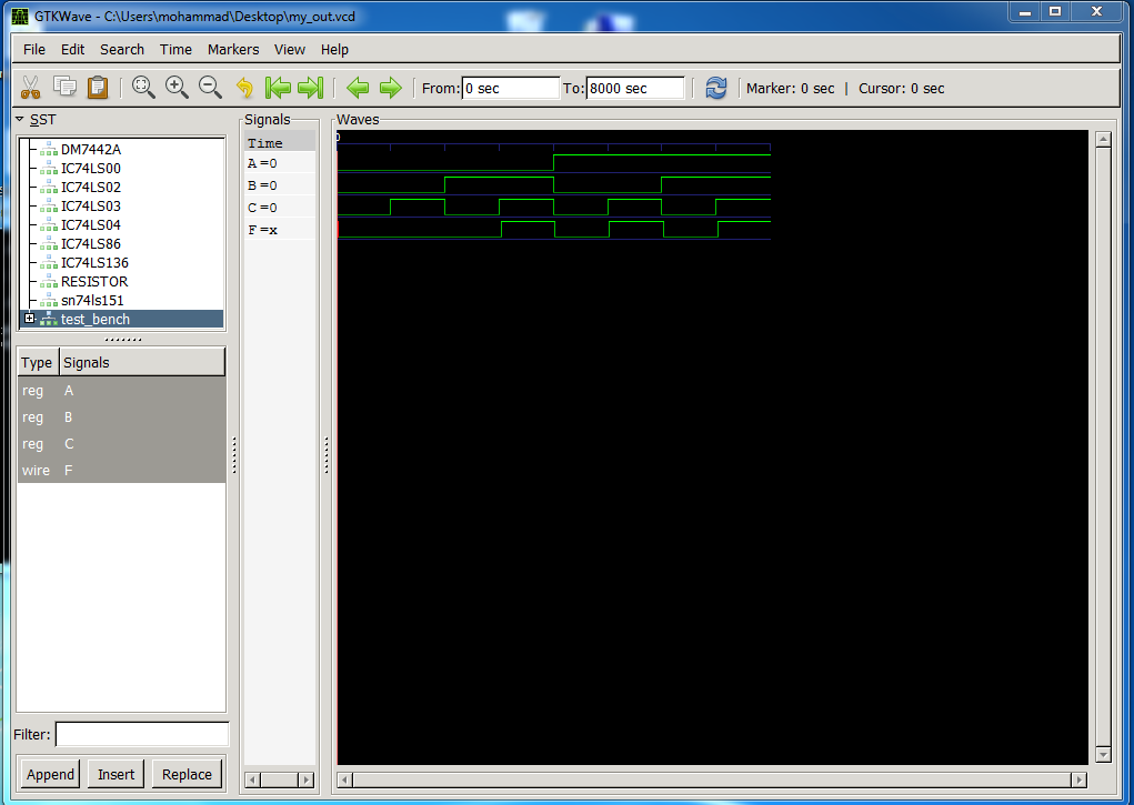 module test_bench(); /*anything that you set in the initial begin...end block should be declared as reg. Here A, B, C stand as the switch operation.*/ logic A, B, C; /* the outputs of instantiated module in the testbench are defined as wire*/ logic F; /* Instantiate Circuit Here */ first_verilog_IC uut(.A(A), .B(B), .C(C), .F(F)); /* Testbench Logic */ initial begin $monitor("(%t): A:%b B:%b C:%b F:%b",$time, A, B, C, F); /* here each 1000 unit timescale the value of A, B, C are chenged. It seems that we change the switches position*/ A = 0; B = 0; C = 0; #1000; A = 0; B = 0; C = 1; #1000; A = 0; B = 1; C = 0; #1000; A = 0; B = 1; C = 1; #1000; A = 1; B = 0; C = 0; #1000; A = 1; B = 0; C = 1; #1000; A = 1; B = 1; C = 0; #1000; A = 1; B = 1; C = 1; #1000; end endmodule // test_bench