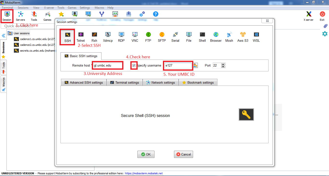 Open MobaXterm then click on Session and select SSH. Write ‘gl.umbc.edu’ in the remote host. Write your umbc user name then run and give your umbc password.