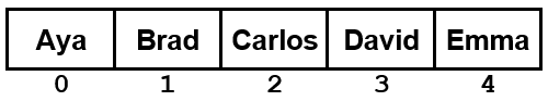 names = ["Aya", "Brad", "Carlos", "David", "Emma"]